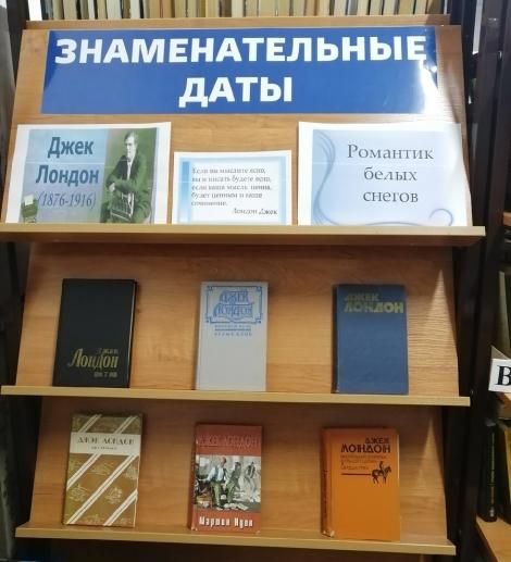 На абонементе центральной библиотеки оформлена книжная выставка "Романтик белых снегов", где представлена литература о жизни и творчестве писателя и его произведения, среди которых: "Белый клык", "Мартин Иден", "Маленькая хозяйка большого дома", "Сердца трех" и т. д.