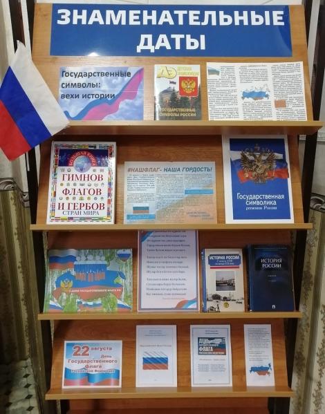 К этой дате сотрудниками библиотеки оформлена обзорная выставка «Государственные символы: вехи истории», где читатели могут узнать о появлении, значении российского флага, о цветах Российского флага, сыгравших большую роль в становлении русского национального культурного сознания.