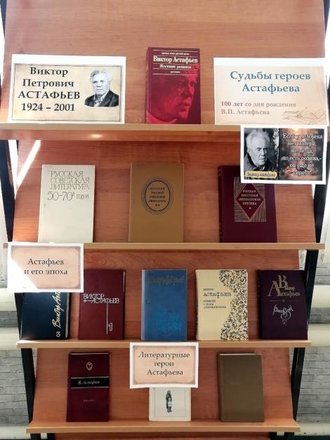 К юбилейной дате писателя в читальном зале Центральной библиотеки оформлена книжная выставка «Судьбы героев Астафьева», на которой представлены художественные произведения автора, а также материалы о жизненном и творческом пути Виктора Астафьева.