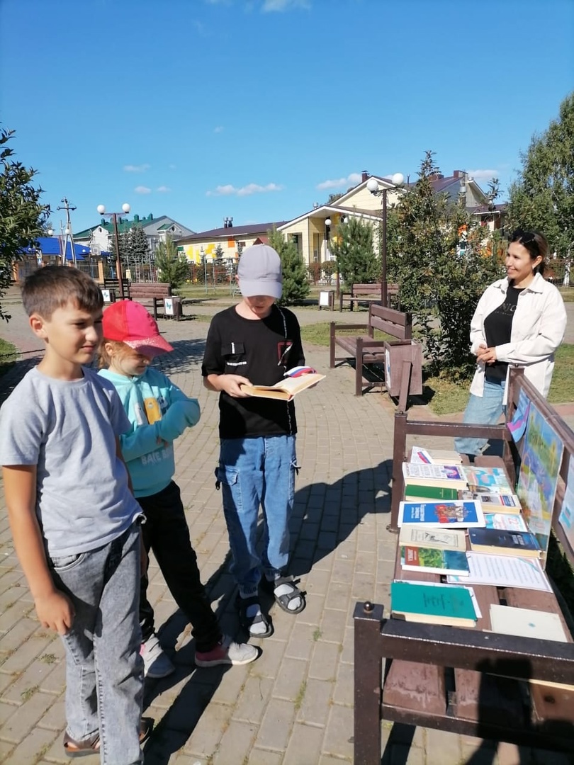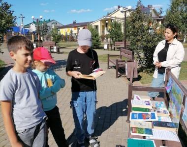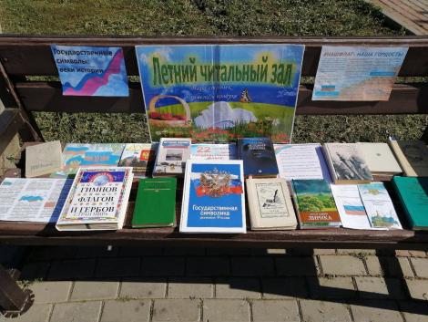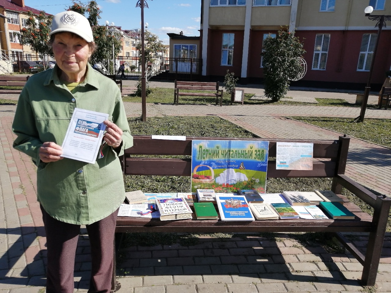 К этой дате 23 августа в рамках летнего читального зала сотрудниками библиотеки была оформлена обзорная выставка «Государственные символы: вехи истории», были розданы буклеты и ленточки в цветах Российского флага. Посетители парка «Яшьлек» могли пополнить свои знания в области российской государственной символики, поучаствовать в интересной викторине, прочитать стихи о России.