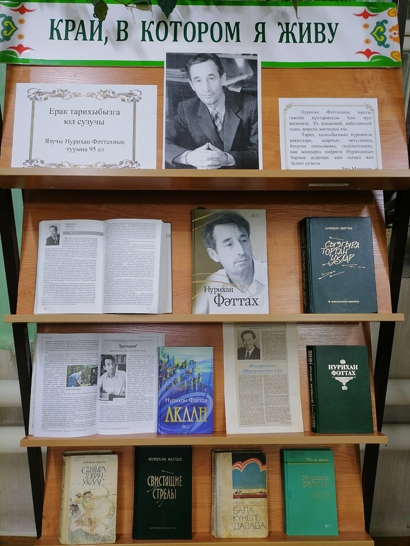 Үзәк китапханәнең татар әдәбияты һәм туган якны өйрәнү бүлегендә күренекле язучы, ТРның халык язучысы, РСФСРның атказанган мәдәният хезмәткәре Нурихан Фәттахның тууына 95 ел уңаеннан "Ерак тарихыбызга юл сузучы" исемле китап күргәзмәсе оештырылды.