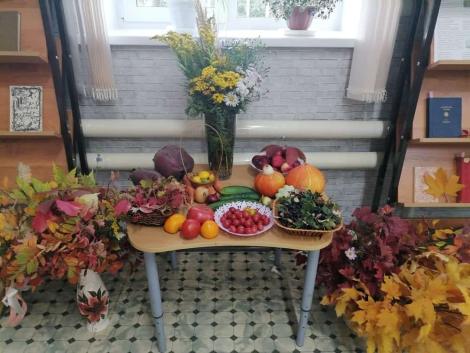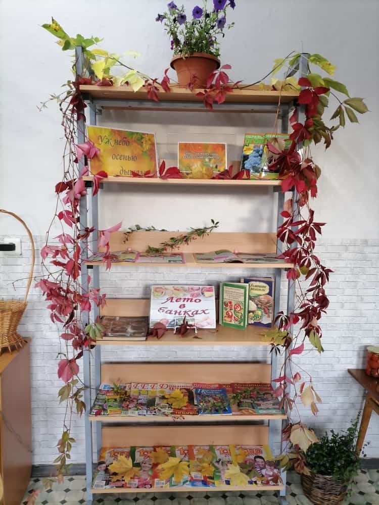 Сегодня к празднику урожая сотрудниками Центральной библиотеки были оформлены осенние композиции и книжные выставки "Осенняя поэзия", "Көзге муллык", "Лето в банках".