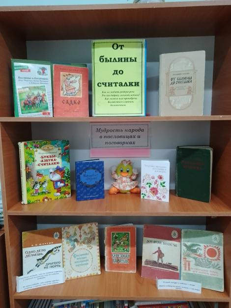 В библиотеке оформлена выставка " От былины до считалки". Читатели с удовольствием вспоминают дразнилки, считалки из своего детства.