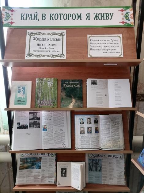 Корбангалиева Асия Фәррах кызы – шагыйрә, республика, район, “Яңарыш” газеталарының даими хәбәрчесе, “Мин – табигать баласы”, “Урман юлы”, “Уразай каеннары” исемле шигырь китаплары авторы, республикакүләм һәм районкүләм иҗади бәйгеләр җиңүчесе. Үзәк китапханәдә аның 65 яшьлек юбилее уңаеннан “Җирдә калсын якты эзем” исемле китап күргәзмәсе тәкъдим ителә.